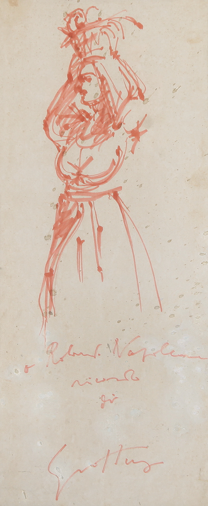 RENATO GUTTUSO Bagheria (Pa) 02/01/1912 - Roma 17/01/1987 Figura, 1973 tecnica mista su carta intelata cm. 61x25,5; firma e dedica dell'artista ad personam in basso, l'opera è stata ritagliata dal "un manifesto del Comune di Bagheria", Galleria d'Arte Moderna e Contemporanea Donazione Renato Guttuso, mostra inaugurata il 24 novembre 1973 come da fotografia allegata, dichiarazione d'autenticità dell'artista e timbri della Galleria Centro Dell'Arte (Roma) su foto, presenta segni di fioriture alla carta.