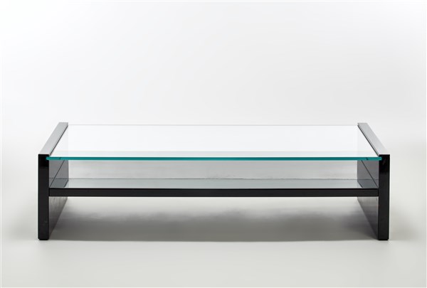 Tavolino da salotto. Produzione Tecno, Varedo, 1975. Legno laccato nero con piano inferiore in legno laccato e piano superiore in cristallo molato. (cm 160x40x70) (difetti)