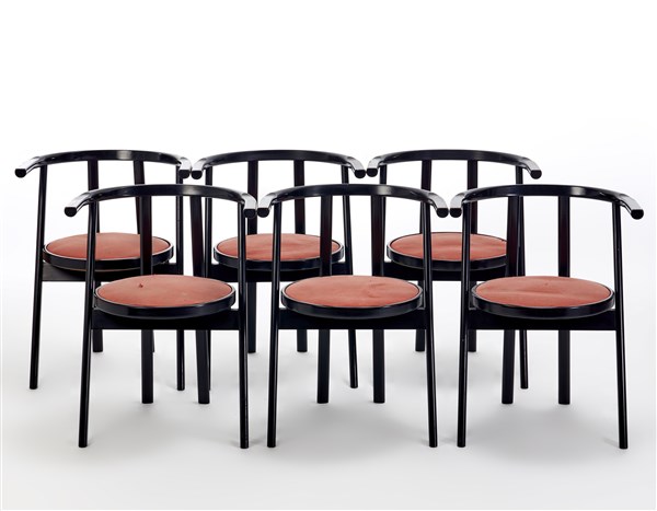 Lotto di sei sedie modello "Alcina". Produzione Cassina, Meda, 1984. Struttura in legno verniciato nero e seduta in tessuto rosso. Recanti etichetta della produzione sulla struttura. (cm 56x70,5x53) (difetti)