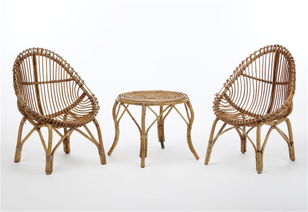 Pair of armchairs and coffee table in rattan. Italy, 1950s. (armchairs 62x85x62 cm; coffee table h cm 50 d cm 56) (slight defects)
