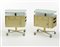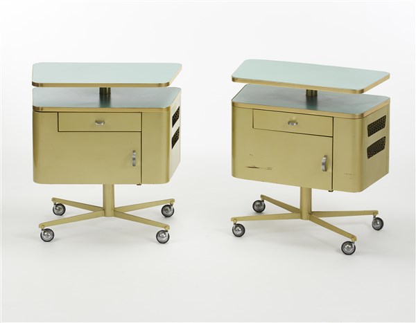 * Lotto di due comodini su ruote ad un cassetto, un'anta, due ripiani a giorno e una tasca porta riviste su un lato. Produzione Officine Valsecchi, Milano, 1957. Acciaio stampato e verniciato color verde metallizzato, piani rivestiti in formica verdina, bordure in alluminio ottonato. (cm 66x74,5x35,5) (lievi difetti)