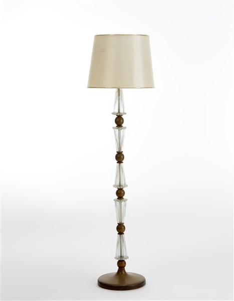 Lampada da terra con base in ottone e fusto formato da coni di vetro soffiato costolato trasparente incolore inframmezzati da sfere in ottone, attacco in alluminio e diffusore in raso color creme. Anni '40. (h tot cm 186) (lievi difetti)