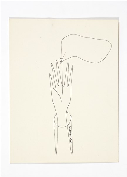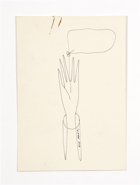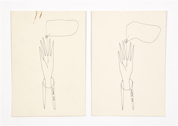 Two greeting cards. Milan, 1950s. Composition depicting a hand with cartouche. Both signed "GIO PONTI". Black ink on cardboard. (15x10.5 cm.) (slight defects)