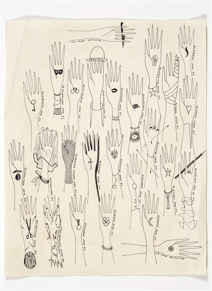 Composition of twenty-six allegorical hands. Milan, 1950s. Black ink on "Roma Tenax P.M.F" watermarked paper. (27.7x22 cm.) (slight defects)