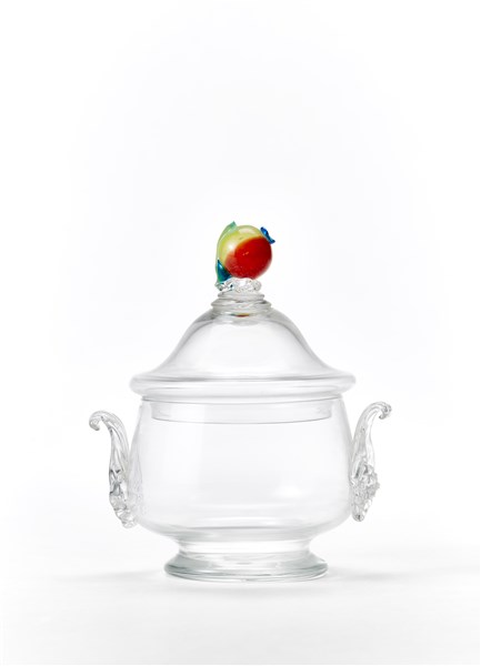 Compostiera in vetro cristallo con morise e frutto in pasta vitrea applicate a caldo. Anni '20. (h cm 15) (difetti e mancanze)