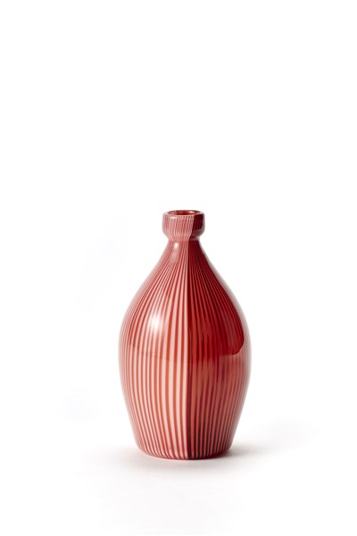 Bottiglia della serie "Tessuti". Murano, 1984. Vetro soffiato a fasce verticali lattimo-rosso antico e ametista chiaro-rosso antico. Firmata a punta sotto la base "venini Paolo Venini 1984". (h cm 22)