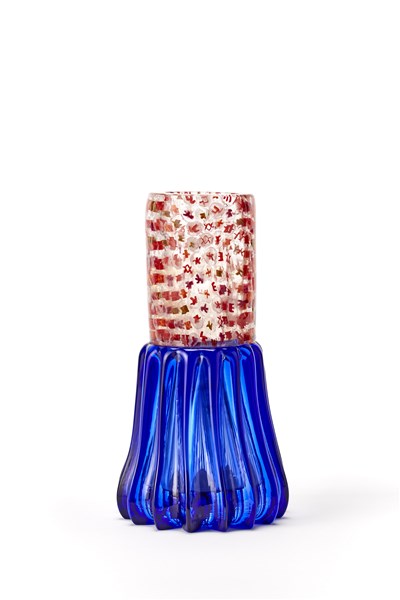 Vaso con corpo cilindrico in vetro soffiato trasparente incolore con inclusione di murrine rosse, arancioni, ametista e ocra. Base troncoconica in vetro costolato blu. Murano, 2002. Firmato e datato a punta. (h cm 29,5)