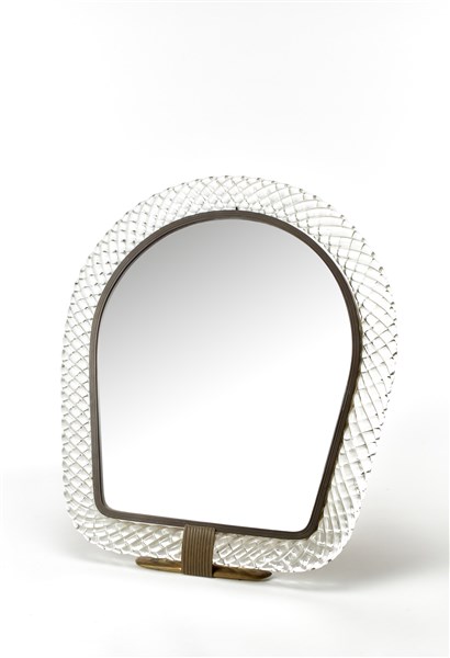 Specchio da tavolo. Murano, anni '30. Cornice in vetro soffiato cristallo lavorato a treccia, montatura in ottone. Marchio Venini incusso nell'ottone al verso. (cm 43x50) (lievi difetti e mancanze)