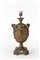Lampada da tavolo di gusto preraffaellita. Italia, anni '10. Fusione di bronzo a forma di vaso biansato su base a quattro piedini decorata con volti di angeli. Corpo a rilievo e traforato con scena popolata da putti e animali su sfondo di viti e grappoli. Anse a foggia di serpenti. (h cm 48)