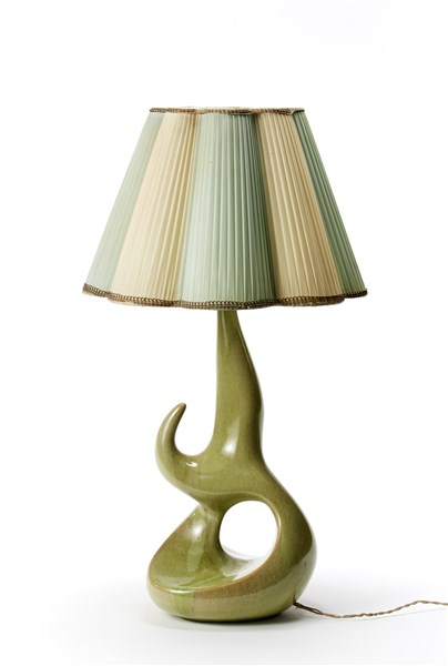 Lampada da tavolo modello "C 272". Società Ceramica Italiana, Laveno, 1953-1954. Terraglia forte formata a colaggio smaltata in color crème maculato; paralume in stoffa plissettata. Marcata sotto la base e con simbolo grafico della manifattura. (h tot cm 61) (lievi difetti)