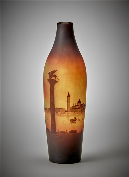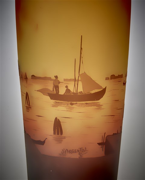 Vaso ovoidale a piccola bocca in vetro doppio con decoro con veduta di Venezia e imbarcazioni con figure nei toni del rosso lacca carminata su fondo color rosso vermiglio e arancio sfumato giallo miele. 1920ca. Firma a rilievo a cammeo "D'Argental". (h cm 30,5)