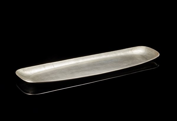 Large rectangular tray in hammered and calendered silver with rounded corners. Satin upper surface. Milan, 1930s. Signed with incussion under the base "Finzi" titled 800. (g 1140) (cm 67x21) (slight defects)