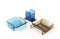 Lot consisting of three centerpieces in blue, light blue and orange transparent glass. Produced by RSVP, 1980s. Signed and marked. In original boxes. (cm 23x19x13; cm 32x10x26.5; cm 30x10x26)