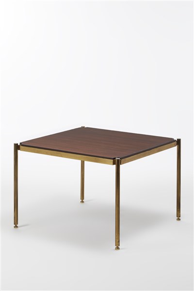 Tavolino da salotto. Varedo, anni '50/'60. Struttura in ottone, piano in legno di palissandro indiano. (cm 72,5x50x72,5) (lievi difetti)