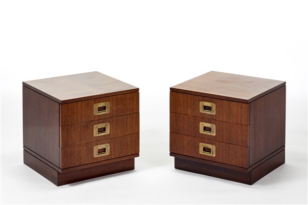 Coppia di comodini a tre cassetti della serie "Parisi 1". Produzione Brugnoli Mobili, Cantù, 1960. Legno di wengé e ottone. (cm 50x49,5x50) (lievi difetti)