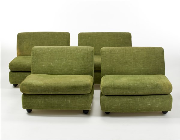 Lotto di quattro poltrone componibili senza braccioli modello "Amanta". Produzione B&B, Italia, 1973. Imbottitura in dacron rivestita in tessuto color verde, scocca portante in fiberglass, struttura del sedile in acciaio annegato nel poliuretano schiumato, piedini sferici in plastica. Marcate sotto la struttura. Segnalazione al "Compasso d'oro" del 1970. (cm 79x68x78) (lievi difetti)