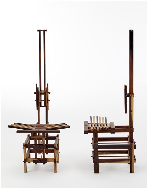 Anacleto Spazzapan Coppia di sedie scultura. Anni '90. Legno naturale ad incastr