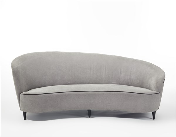 Divano di forma mossa con rivestimento in velluto grigio e piedini troncoconici in legno massello. Italia, anni '50/'60. (cm 200x74x104) (restauri)