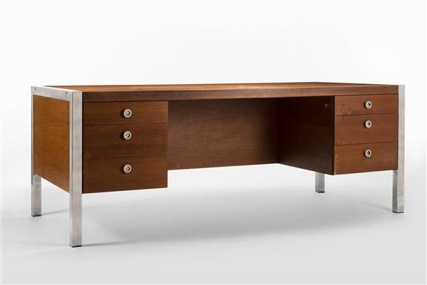 Scrivania con due cassettiere modello "Tecnika". Produzione Design Center - Poltronova, Firenze, anni '70. Legno impiallacciato e acciaio cromato. Recante etichetta della produzione. (cm 200x75,5x90) (difetti e mancanza delle chiavi)