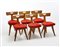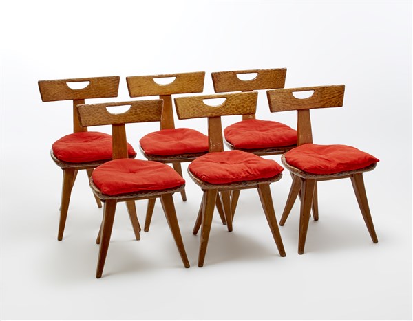 Lotto composto da sei sedie in legno massello di castagno intagliato e lavorato a bacellatura. Italia, anni '50. (cm 43,5x76x50) (lievi difetti)