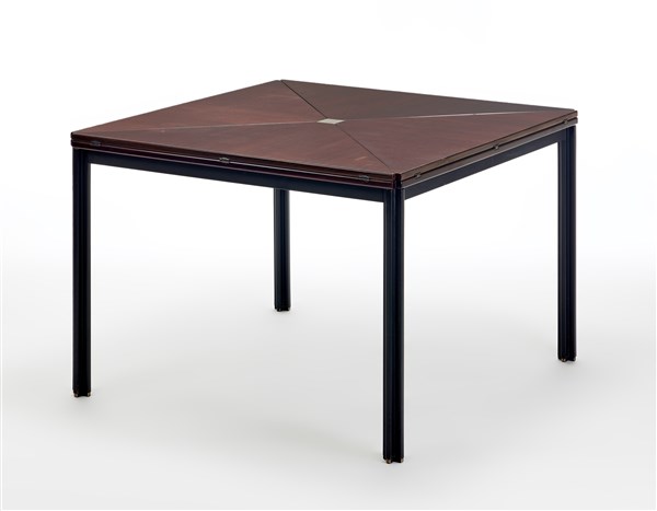 Folding table model "T92". Produced by Tecno, Varedo, 1960. Cross legs in black painted metal, top in Indian rosewood with central element in nickel-plated metal. Mention at the "Compasso d'oro" 1970. (closed 105x74x105 cm) (slight defects)