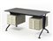 Scrivania con due cassettiere a tre cassetti della serie "Arco". Produzione Olivetti Arredamenti Metallici, Ivrea, anni '50. Metallo verniciato nero, piano in metallo rivestito in laminato plastico, cassettiera in metallo verniciato grigio con cassetti in plastica grigia. Recante marchio della produzione. (cm 160x76,5x80) (difetti)
