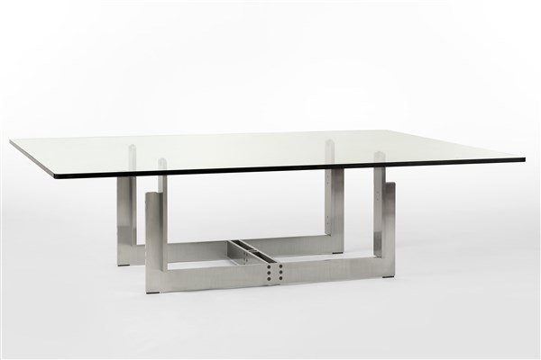Tavolino modello "Florian". Produzione Simon, Bologna, anni '70. Base in acciaio satinato e piano in cristallo. (cm 154,5x44x113,5) (lievi difetti)
