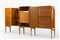 Wooden sideboard with three doors, one with grissin front, fall front door, two drawers and shelf with burgundy back-painted glass top. Italy, 60. (268x138x44 cm.)