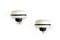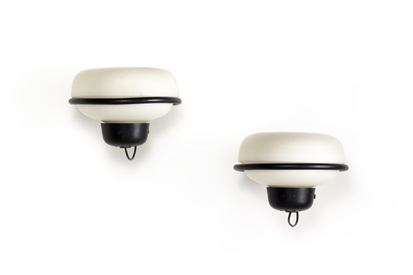 Coppia di lampade da parete modello "228/e". Produzione Arteluce, Milano, 1957. Diffusori in vetro satinato, coppetta portalampadina e anello in alluminio verniciato nero, attacco ovale a muro in alluminio. (d cm 25,5) (difetti)