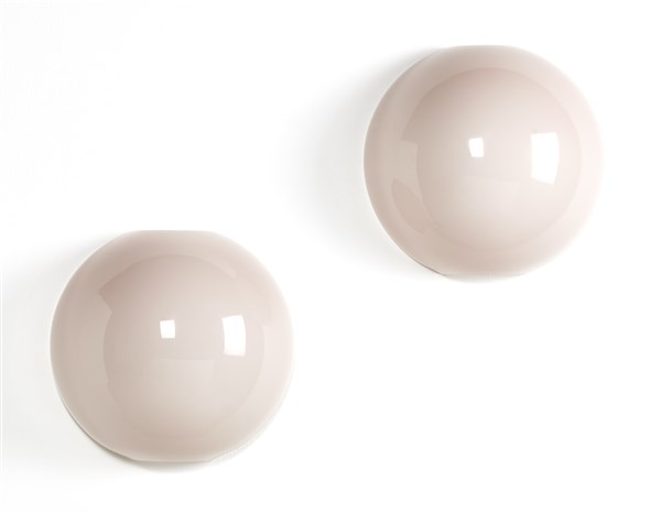 Coppia di lampade da parete modello "Pin". Murano, 1986. Struttura in acciaio verniciato bianco e paralumi a calotta in vetro incamiciato rosa e lattimo. Firmati e datati a punta “Venini 86”. (d cm 29,5)