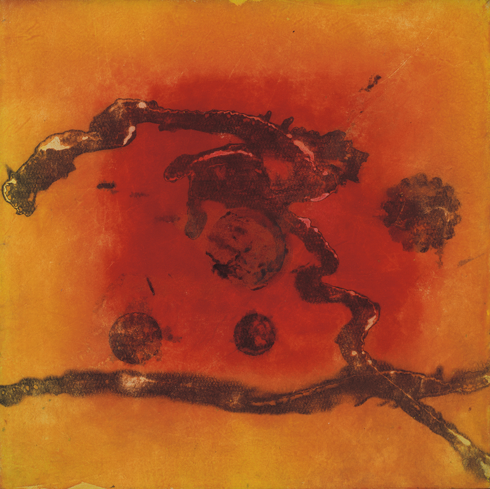 MARCO NEREO ROTELLI Venezia 14/05/1955 Combustione rossa tecnica mista e combustione su fibra e tela cm. 100x100, firma e titolo al retro, dichiarazione di autenticità dell'artista su foto.