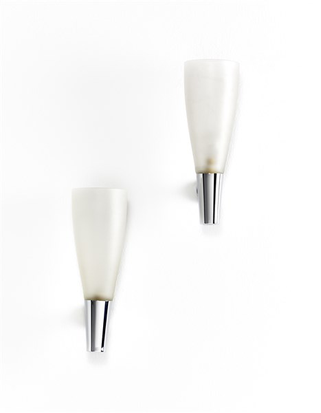 Due lampade da parete a una luce modello "1537". Produzione Fontana Arte, Milano, anni '50. Ottone cromato e vetro satinato. (h cm 28,5)