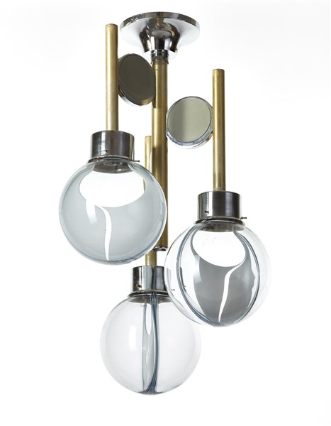 Toni Zuccheri (Attribuito) Lampada a sospensione a tre luci globi diffusore a "m