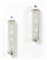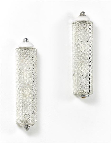 Coppia di lampade da parete con struttura acciaio e metallo verniciato bianco, diffusore in vetro "prismatico". Murano, anni '30/'40. (l cm 43) (lievi difetti e sostituzioni)