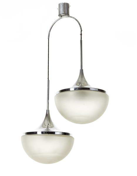 Suspension lamp with two lights.. Chromed metal structure, glass shade on the external surface. Bearing the manufacturer's paper label. (h 105 cm.)