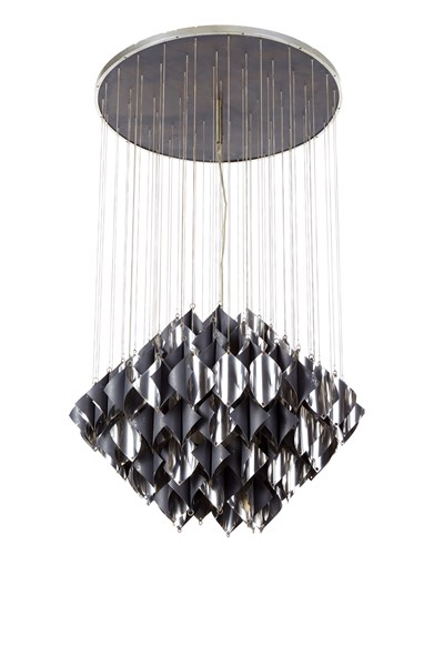 Lampada a sospensione con disco centrale e attacco in metallo, catene e pendenti in metallo cromato e verniciato nero a forma quadrata e inflessa. Italia, anni '70. (d cm 63) (lievi difetti)