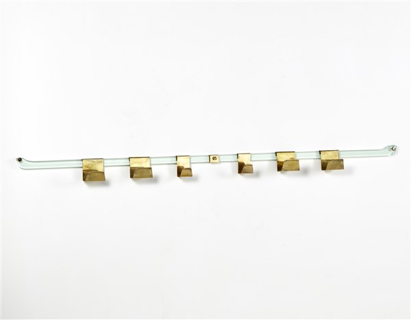 Appendiabiti da parete in cristallo a sei appendini mobili in ottone. Italia, anni '50. (l cm 138) (lievi segni d'uso)