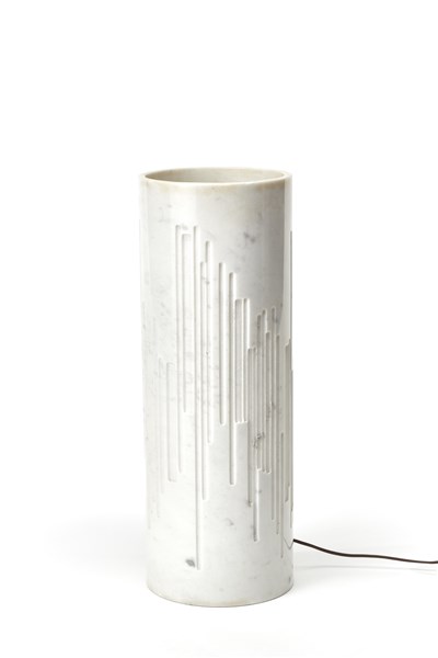 Cilindro luminoso C8 105 LC. Forme e Superfici – Sezione Arredamento – Contrappunti per l’arredamento, Torino, anni '70. Marmo bianco di Carrara con decoro fresato sulla superficie. Recante etichetta sotto la base. (h cm 40; d cm 14,5) (lievi difetti)