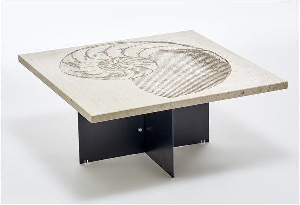 Tavolo da soggiorno M CONCHIGLIA (TS/CTM). Torino, anni '70. Base in acciaio verniciato a fuoco e piano in marmo di Trani con decoro a rilievo raffigurante un Nautilus. (cm 80x35x80) (lievi difetti)