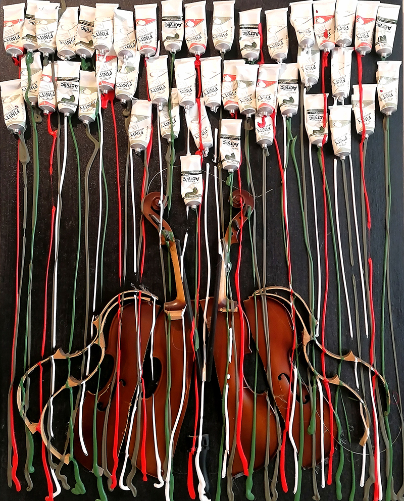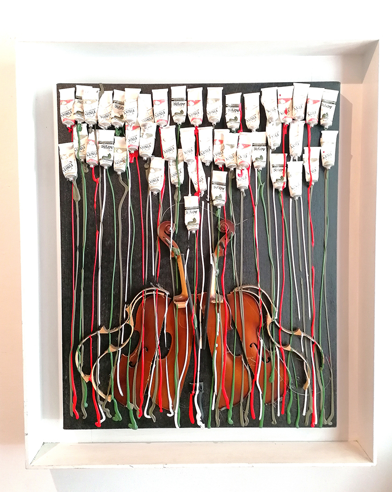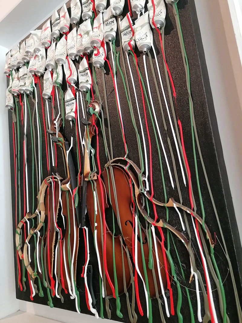 Tubetti di colore rosso, bianco, verde, muschio e violino spezzato su tela riportata su tavola