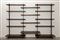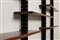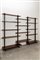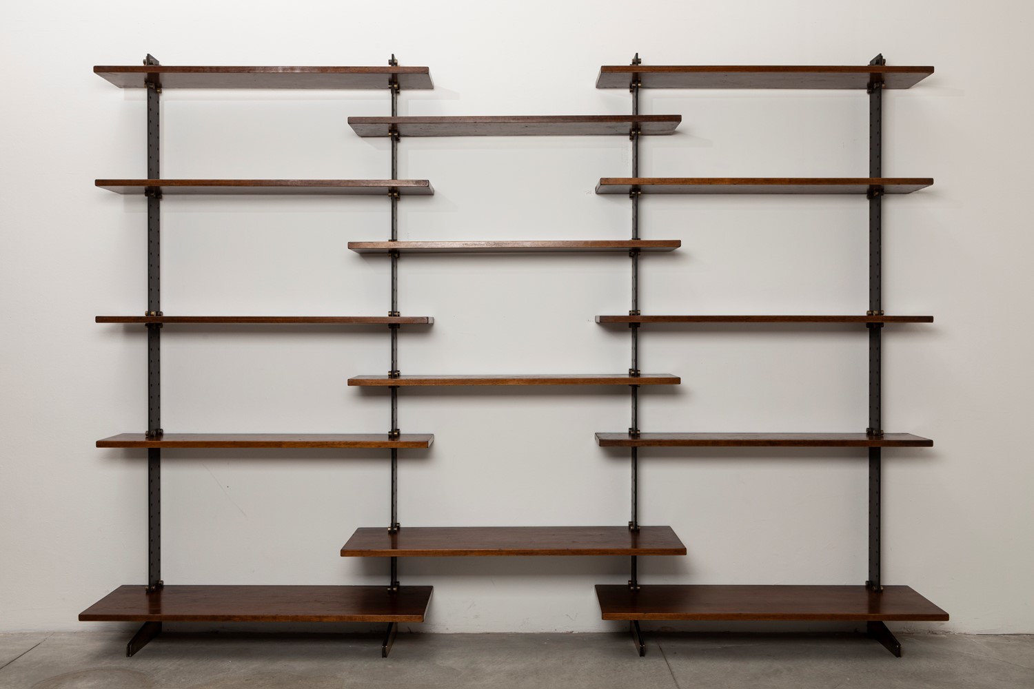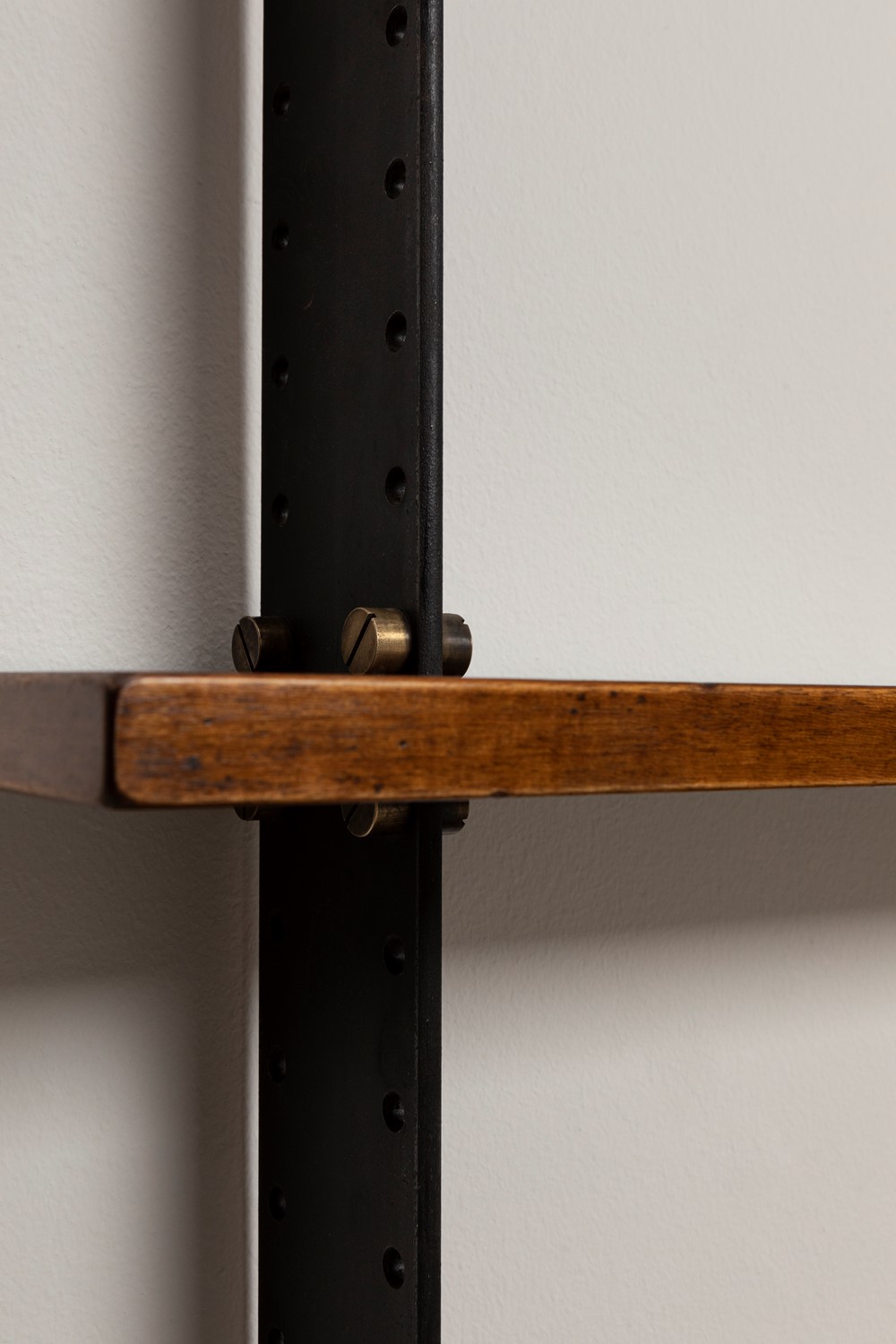 con montanti in metallo laccato e ottone. Mensole in legno.