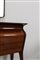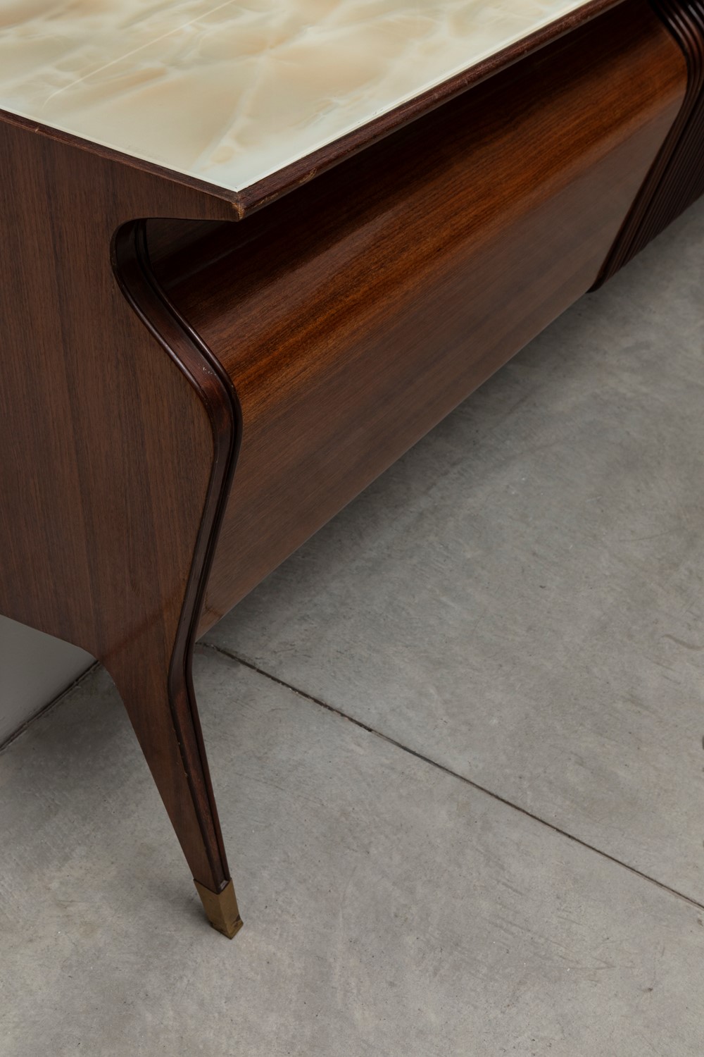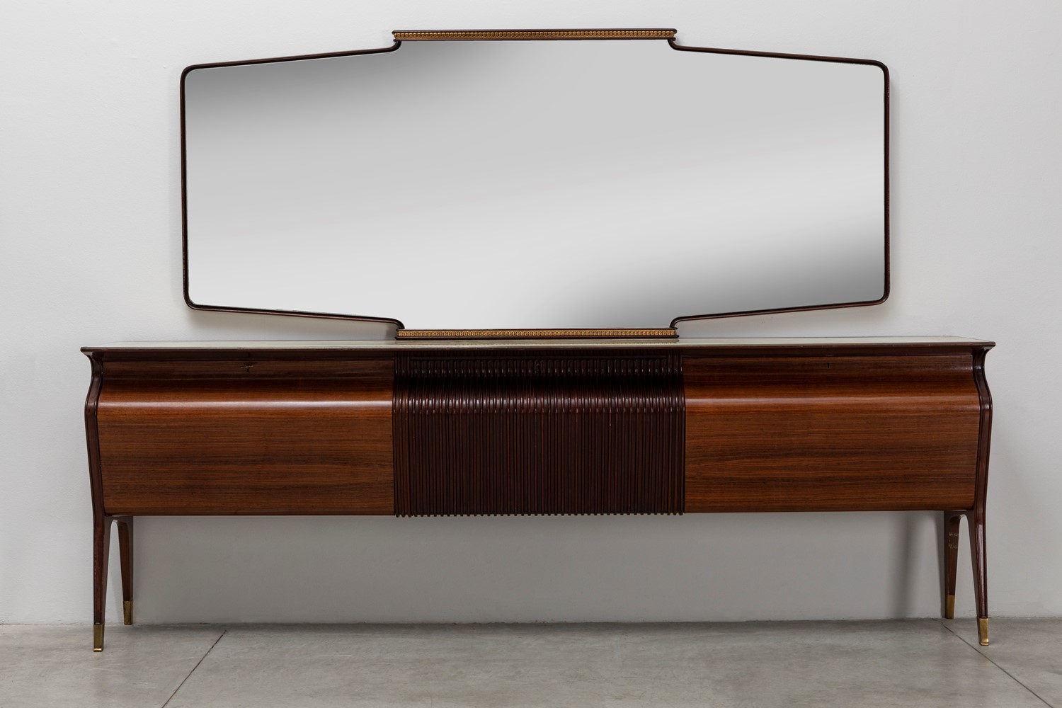 legno massello e impiallacciato in palissandro indiano, guarnizioni in ottone, piano in vetro retro verniciato e interno in acero.
