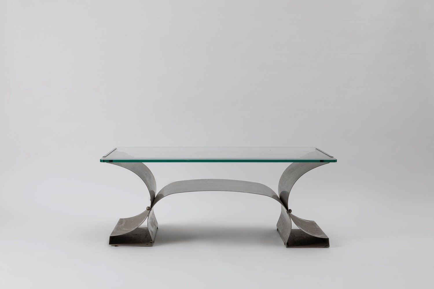 in acciaio inossidabile spazzolato sormontato da un piano in vetro circondato da clip metalliche.