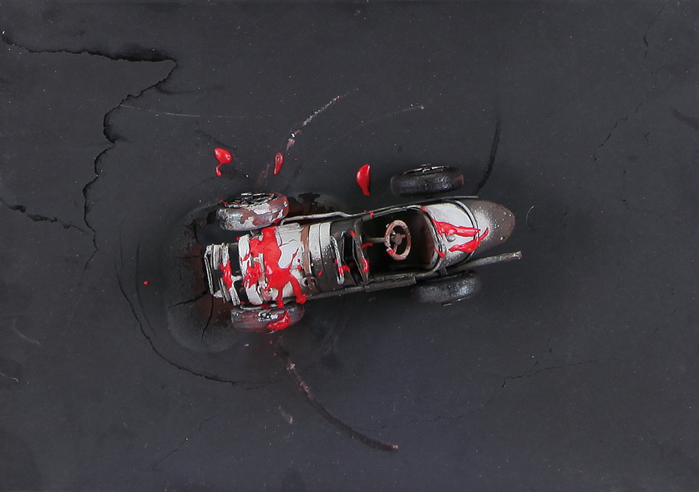 BERNARD AUBERTIN Fontenay aux Roses 1934 Senza titolo, 2010 acrilico e modello in metallo di automobile bruciato e applicato su tavola cm. 27,5x37,5x8; firma e anno al retro, dichiarazione d'autenticità dell'artista e timbro "Collezione Berardelli" su foto, entro teca in plexiglass.