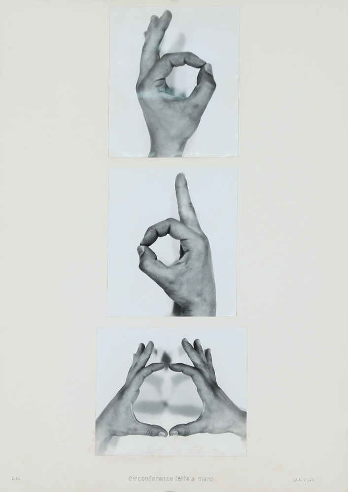 ALDO SPINELLI Milano 1948 Circonferenze fatte a mano, 1971 tre fotografie in bianco e nero applicate su carta cm. 70x50, firma in basso a destra, anno in basso a sinistra, titolo in basso al centro.