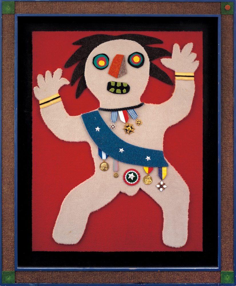 ENRICO BAJ Milano 31/10/1924 - Varese 15/06/2003 Sir James Scott duke of Monnouth, 1977 multiplo in tessuto e metallo con cornice in legno e tessuto cm. 101x82, esemplare V/XXX, firma su etichetta al retro.