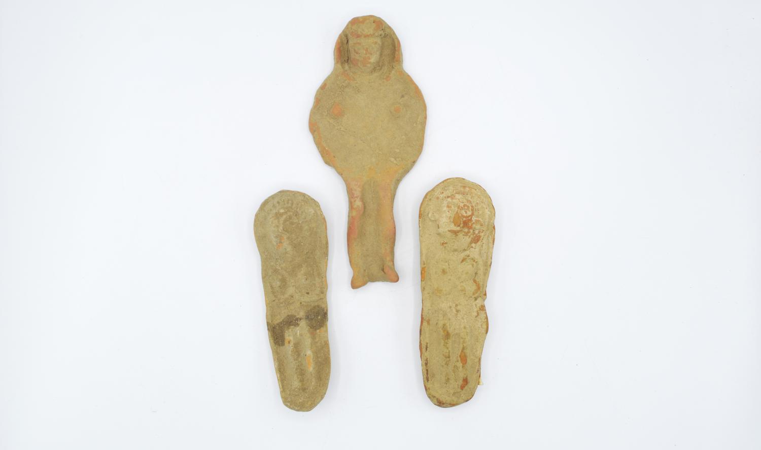 Tre statuette modellate solo nella parte anteriore come una figura umana giacente con le braccia piegate sul torace a sostenere i seni.