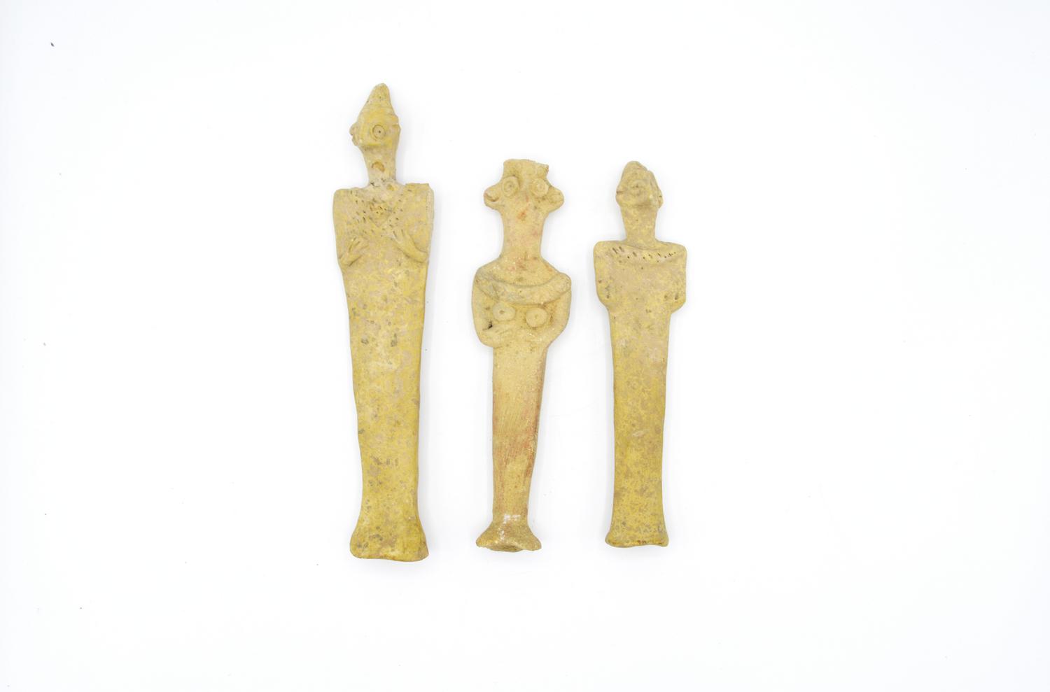 Tre statuette modellate a divinità femminile stilizzata stante in posizione frontale con e le braccia piegate sul torace, la veste arriva fino al suolo; il volto è dominato dal grande naso a becco d'uccello, gli occhi, i seni e l'ombelico sono applicati; al collo portano una collana. (3)