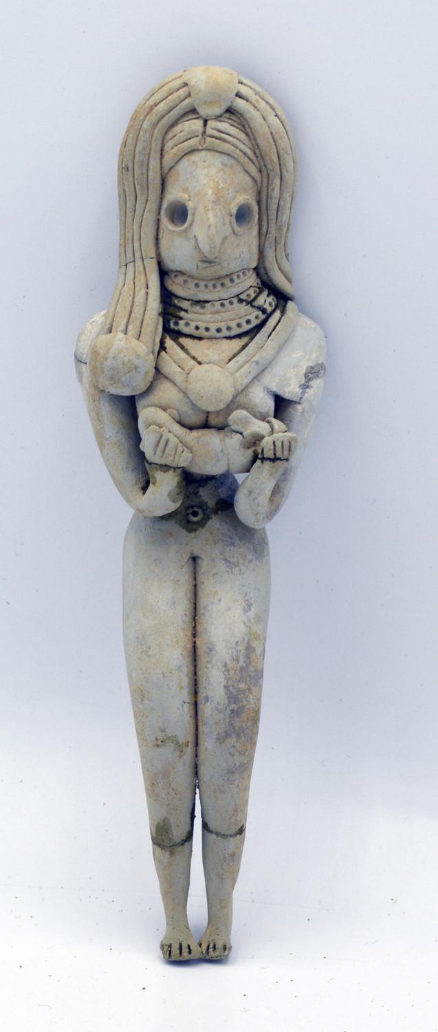 Figura femminile con testa stilizzata, volto con naso a becco di uccello, nuda con collane e lunghi capelli dall'elaborata acconciatura; braccia protese in avanti ad allattare un bambino.