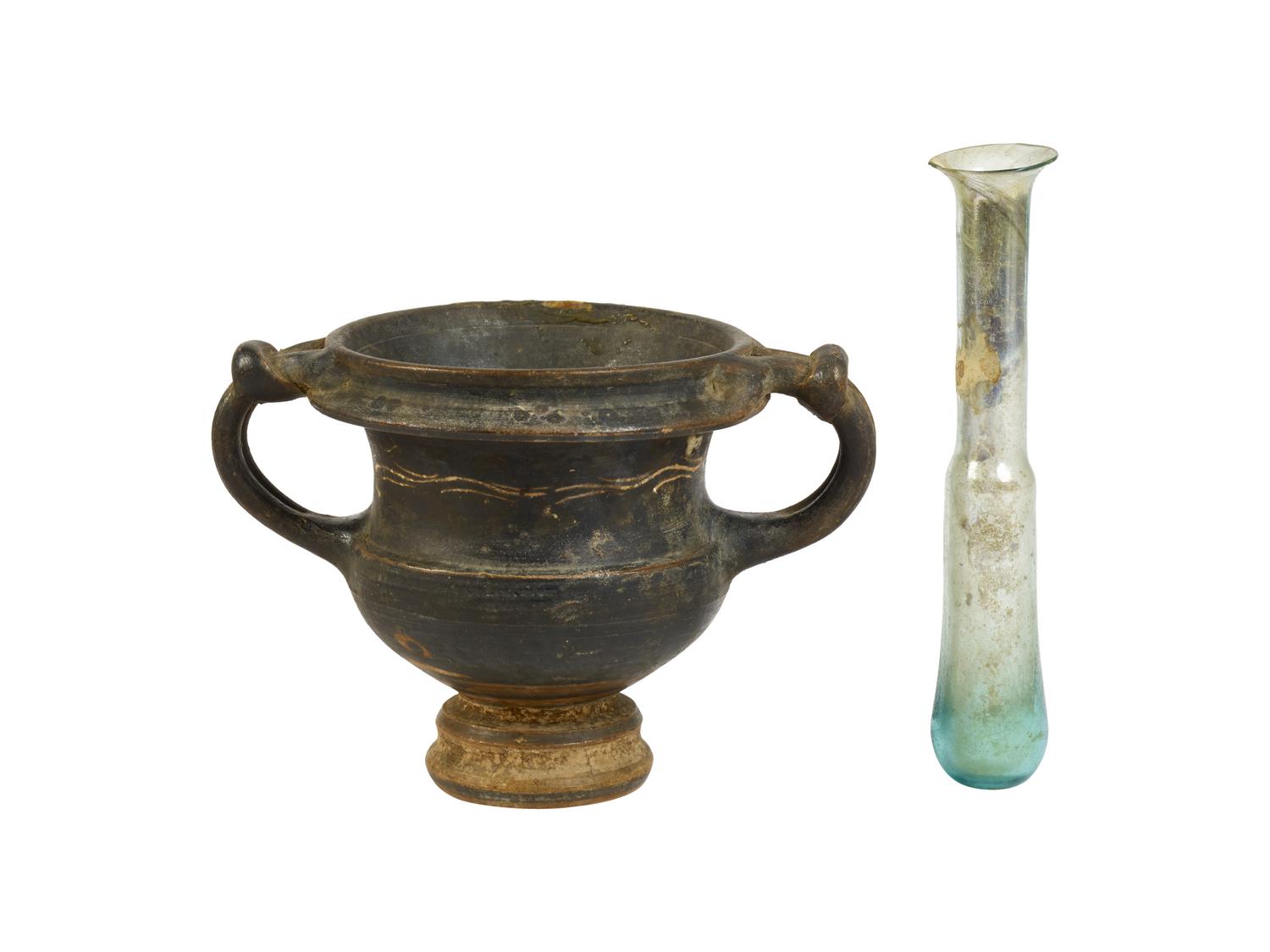 Kantharos con orlo a tesa ed alto collo cilindrico a profilo concavo, bassa vasca troncoconica, piede ad echino modanato, anse a doppio bastoncello verticali impostate dal labbro alla vasca e annodate nella parte superiore; decorato sul collo con tralcio fitomorfo orizzontale; unguentario con orlo arrotondato, lungo collo cilindrico, estremità a bulbo. (2)